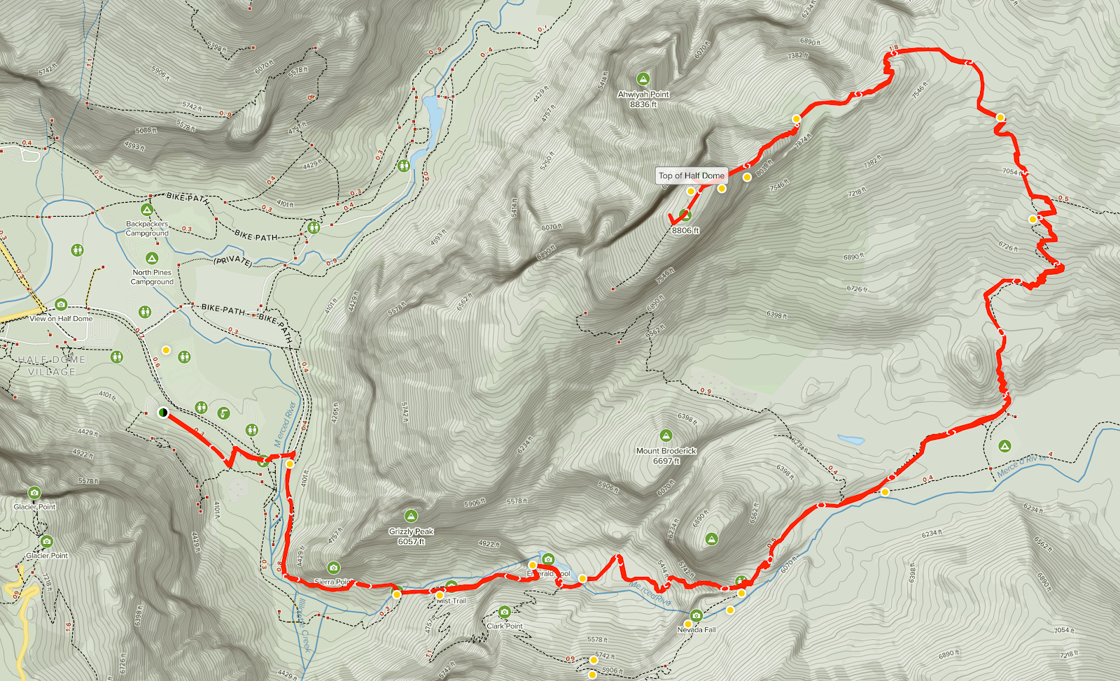 Elevation: 8,842 ft (4800 ft elevation gain from Yosemite Valley)