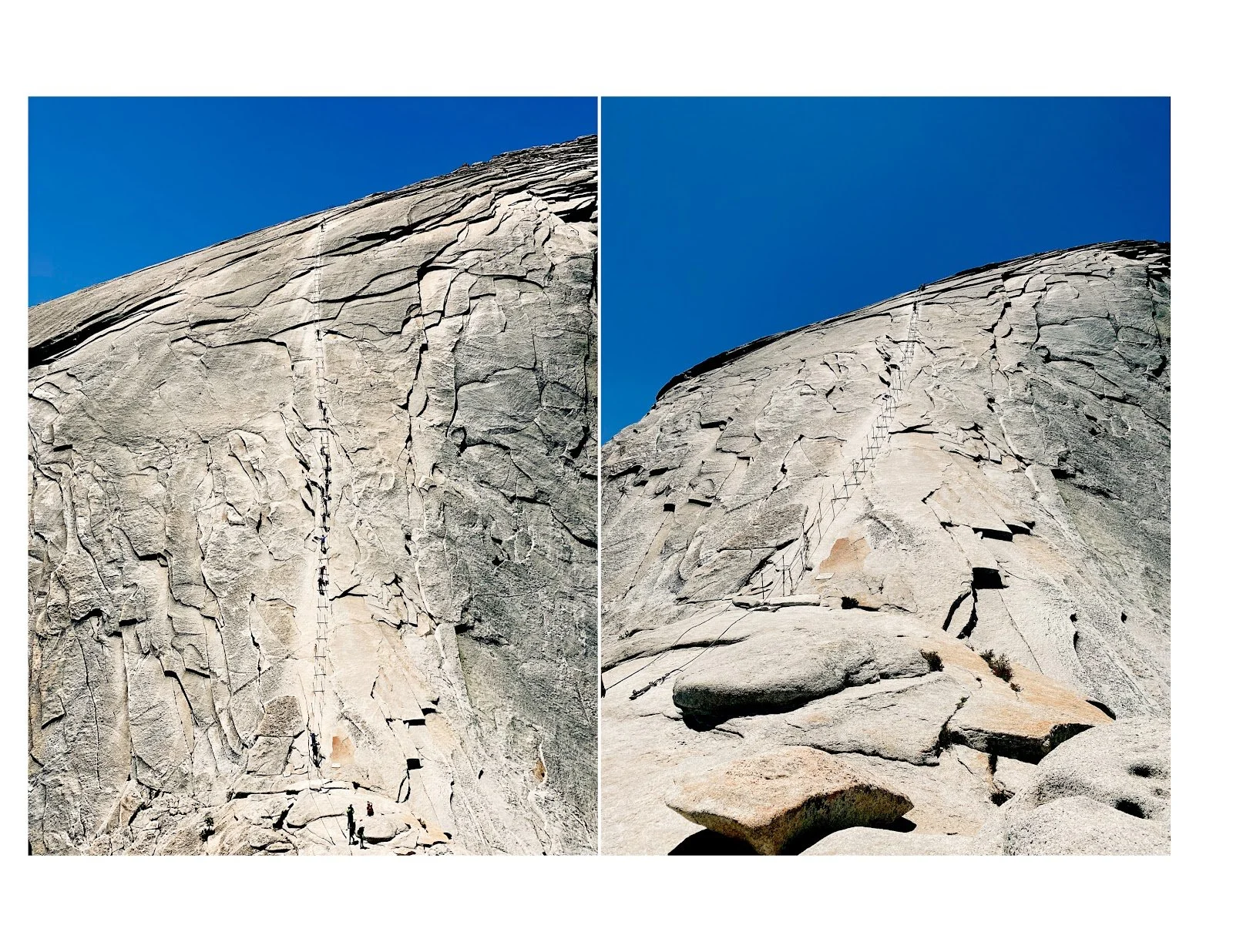 At long last, we reached the base of Sub Dome. This is as far as you can go without a permit. The rangers were super friendly, and after checking everyone’s permit, they gave a brief safety presentation. I’d say that there was no turning back after this, but in all honesty, Sub Dome was tougher, mentally, than going up the cables. The 400ft climb up and over Sub Dome involves more switchbacks, on VERY uneven steps carved straight out of the granite. There are no railings to hold onto, and in almost all directions, it’s a straight fall down. This is where the last member of our small group called it, and I can’t say that I blame her. I continued up and over, driven by the previously mentioned stubbornness and sheer exhilaration. The cable portion loomed up in front of me. I took a quick breather, pulled on my gloves, made sure that my pack was secure, and before I could have any second thoughts, I started the final 400 ft, 45-55 degree, ascent up the cables.